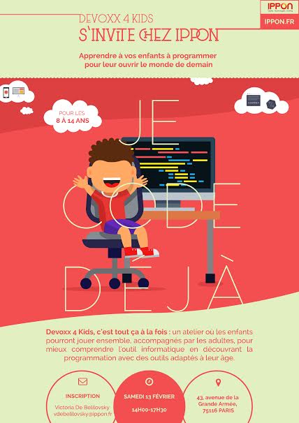 Samedi 13 février, Ippon et Devoxx4Kids organisent un après-midi d’ateliers pour initier les enfants ( entre 8 et 14 ans) à la programmation informatique.