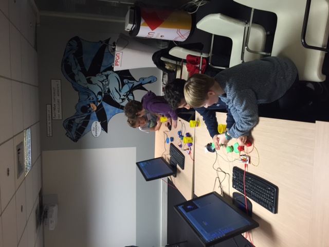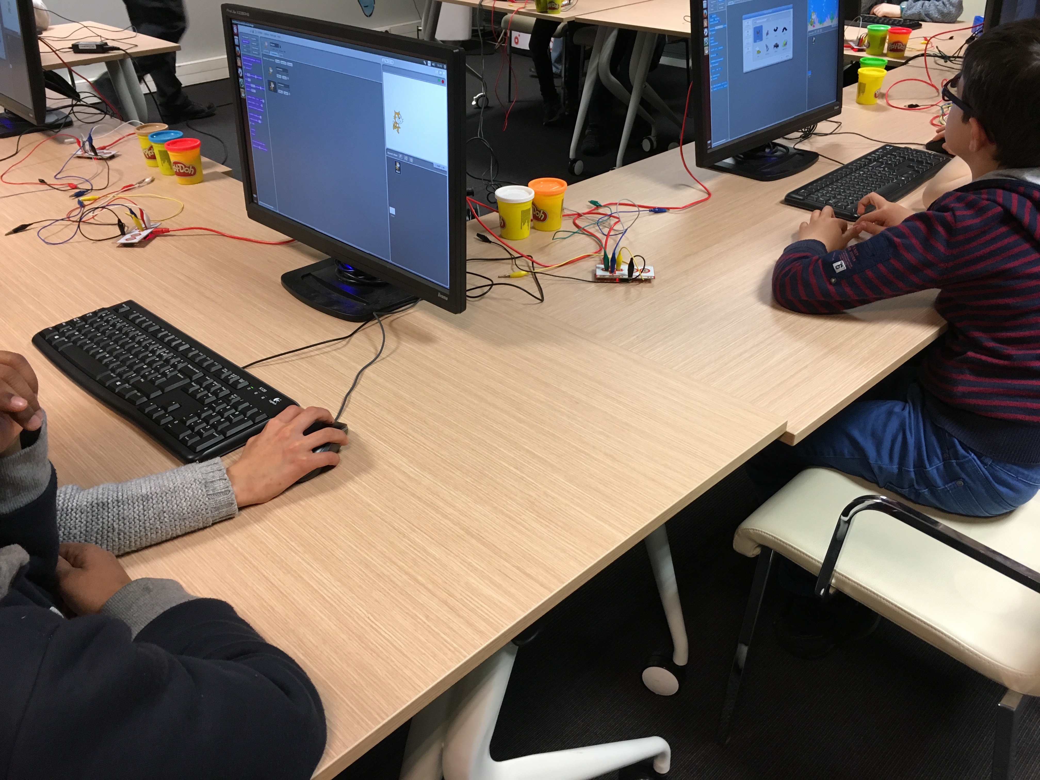 L’atelier de Scratch était en deux temps. Dans un premier temps, les enfants pouvaient créer des jeux d’animation et comprendre les évènements, les boucles, etc. Ensuite, à l’aide d’un joystick un peu particulier, le Makey makey, ils ont pu faire bouger leurs oeuvres avec un clavier en pâte à modeler.