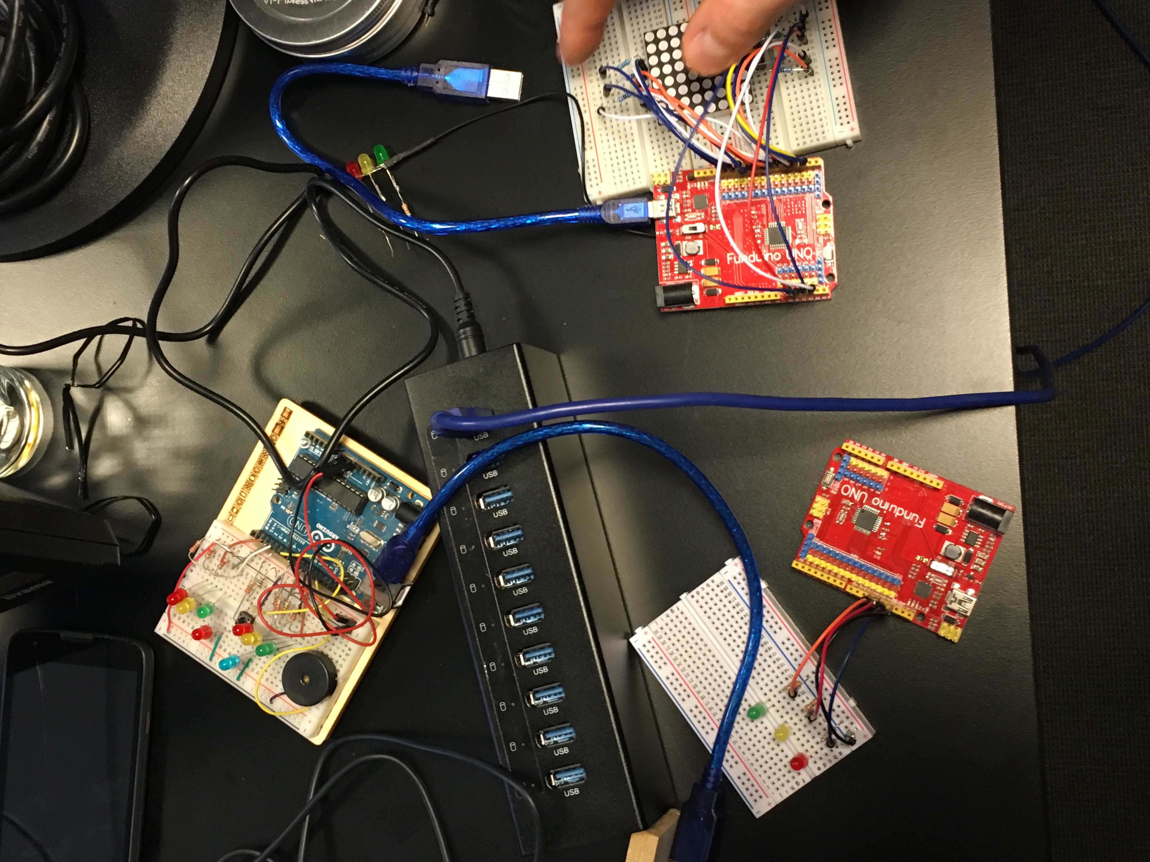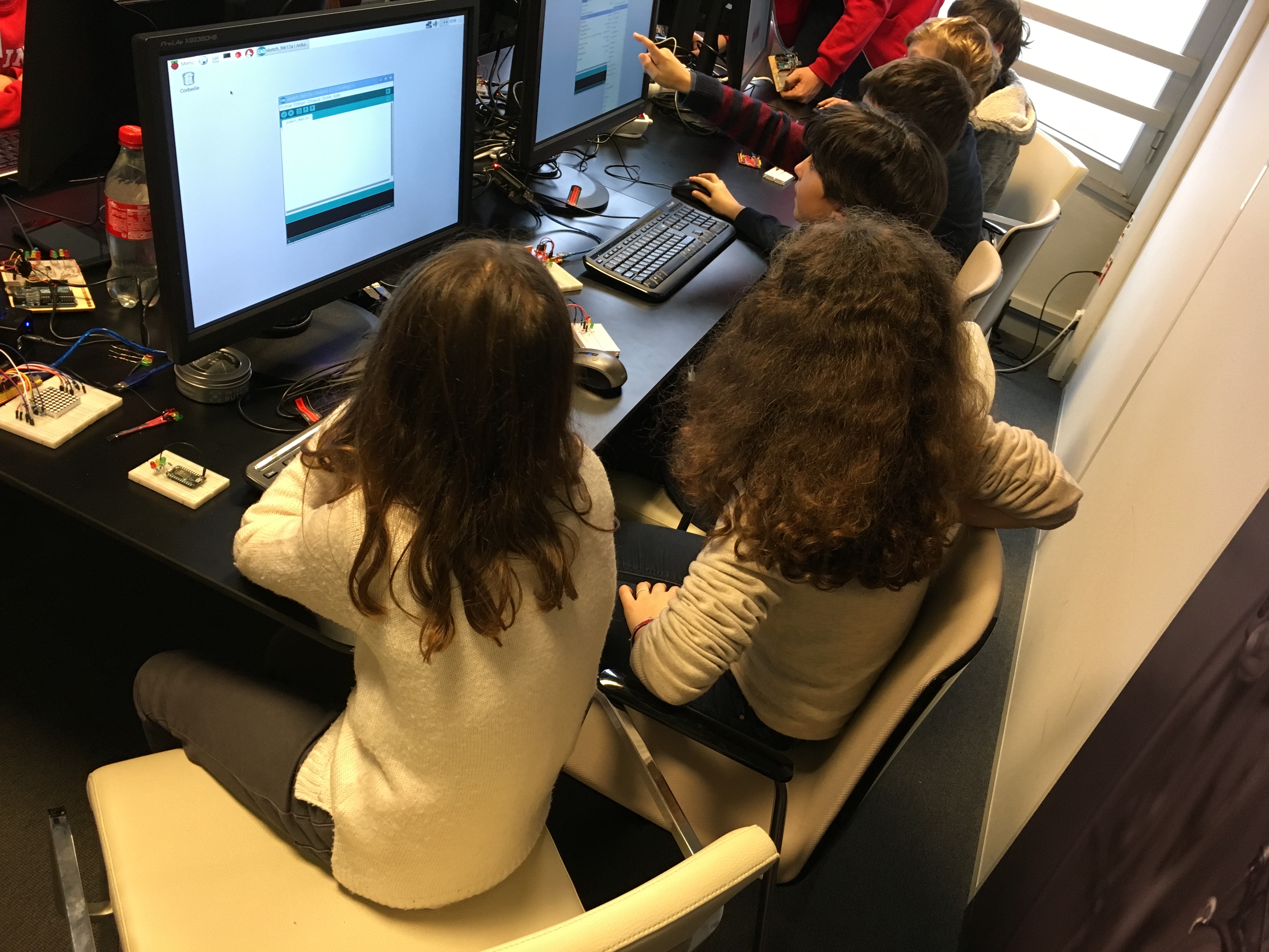 L’atelier Arduino consistait à réaliser un feu de signalisation en actionnant et désactivant 3 diodes dans un montage électronique simple. Les diodes devaient suivre différents ordres pour permettre de réaliser un feu rouge utilisable pour leurs jeux de voitures à venir.
