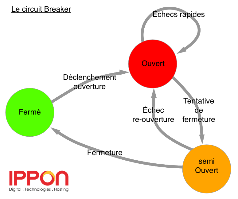 Dès qu’une erreur a lieu ou qu’une requête met trop de temps à répondre, il va surveiller encore plus attentivement vos communications. Si trop d’erreurs (exceptions ou expirations de délais) se produisent, il bascule en mode OUVERT. À partir de ce moment là, toutes vos requêtes échoueront avec une exception de manière automatique, jusqu’à ce que le circuit breaker refroidisse. Il passe alors en mode SEMI-OUVERT : la prochaine requête sera exécutée normalement et si elle réussit, le circuit repasse en mode FERMÉ. Si elle échoue, il repasse en mode OUVERT jusqu’à ce qu’il refroidisse à nouveau.