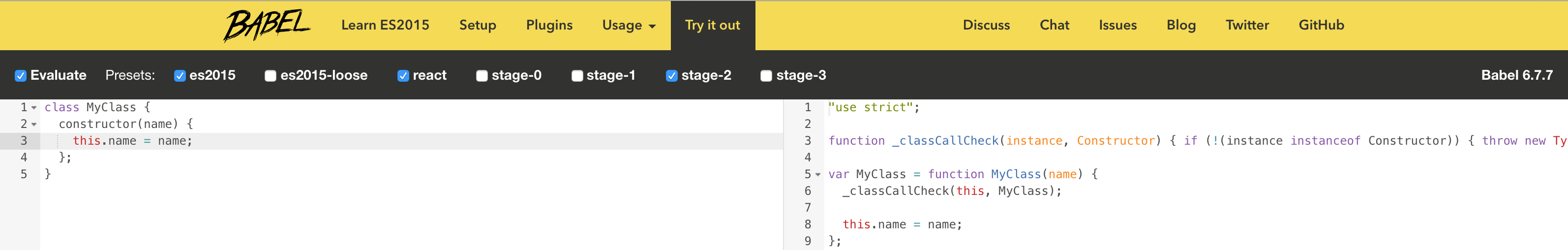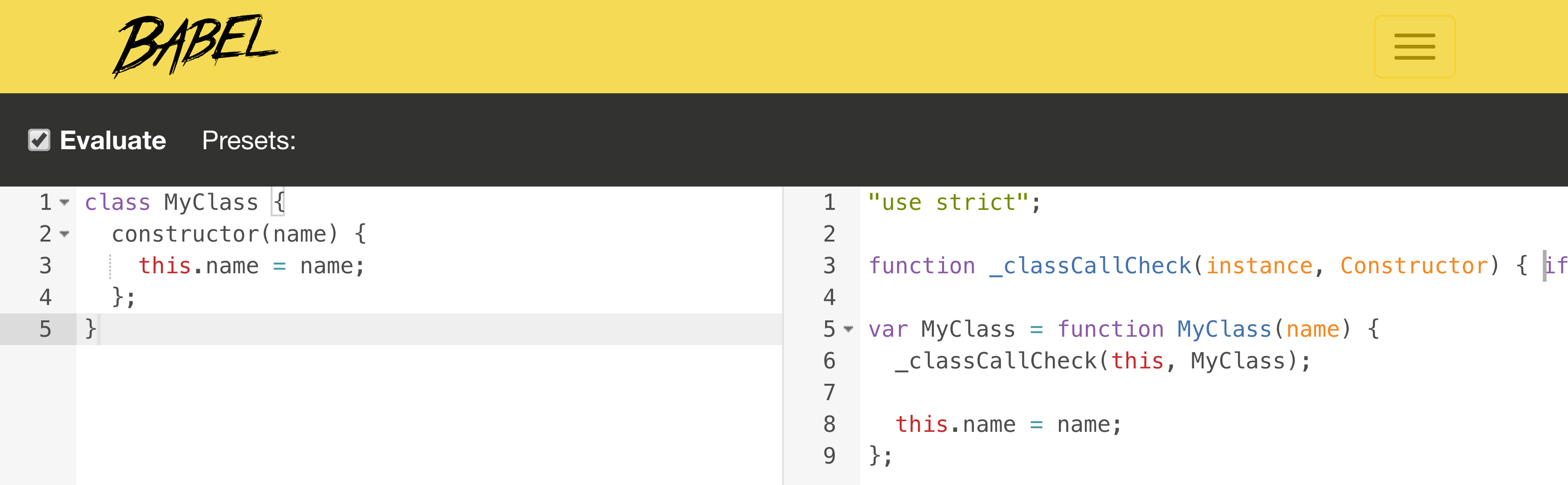 Grâce à Babel, on voit que le code transpilé de cet exemple est très long et demande de bonnes connaissances JavaScript pour aboutir au même résultat que le code ES6. Cette nouveauté arrive avec pleins de mots-clés qui parlent d’eux mêmes : class, extends, constructor, super, this, static, get, set, etc.