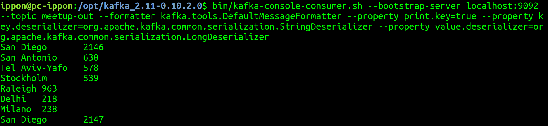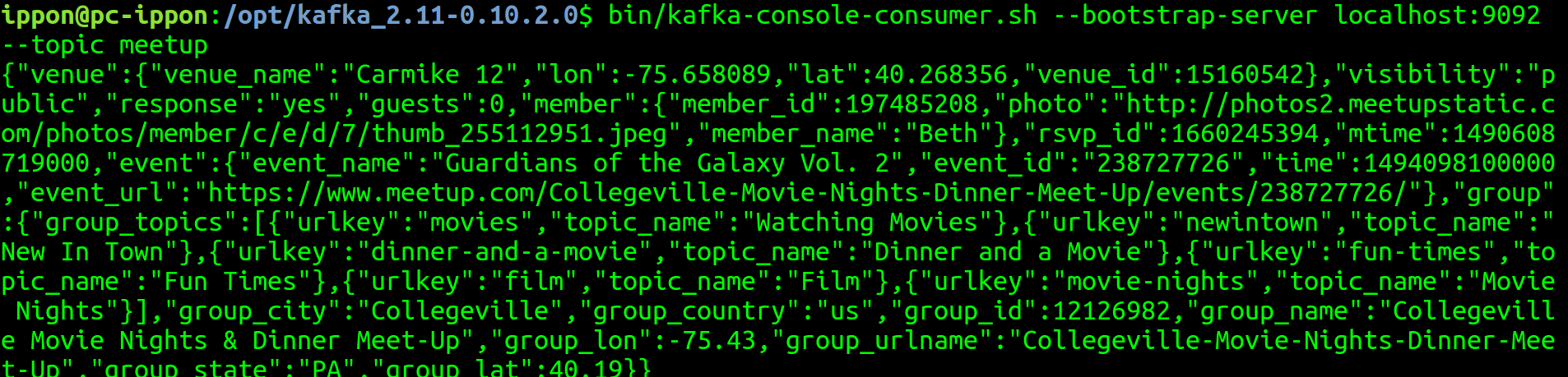 Voici ce que donne la sortie de ce programme en faisant pointer la console consumer de Kafka dans le topic meetup-out.