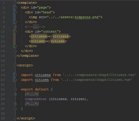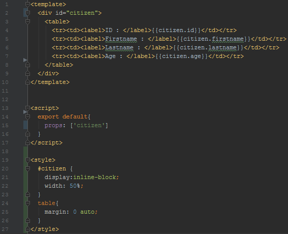 Considérons un composant CitizenPage.vue importé dans App.vue et incluant deux autres composants, Citizens.vue développé précédemment et listant l’ensemble des citoyens de la ville, et Citizen.vue permettant d’afficher le détail d’un citoyen :