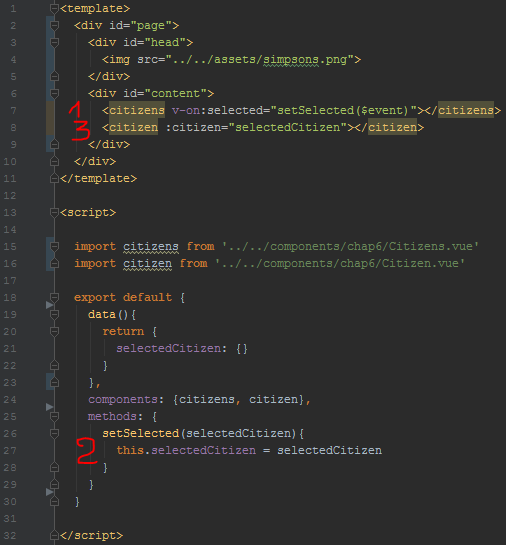 - Dans le composant parent CitizenPage.vue l’événement ‘selected’ émis par le composant Citizens.vue est capté au niveau de l’élément HTML auquel il est rattaché dans le template (