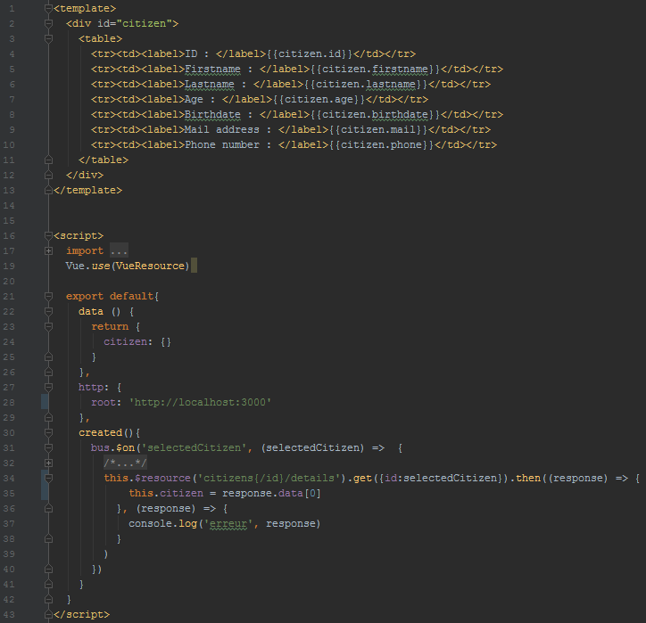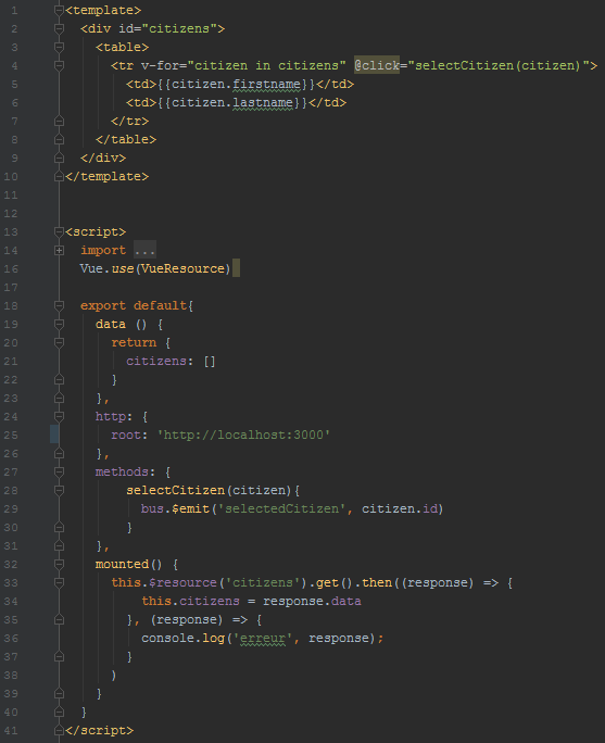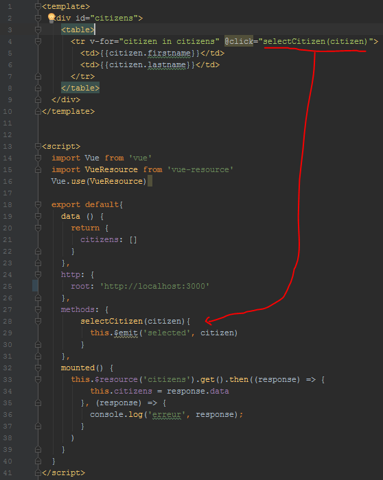 Dans Citizens.vue on détecte l’événement “clic de souris sur un item de la liste” avec la directive v-on:click (raccourci @click) et on y associe l’exécution d’une méthode diffusant l’identifiant du citoyen sélectionné dans la liste :