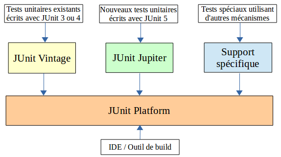 Ce découpage doit favoriser l’intégration de JUnit dans les outils (IDE, build, intégration continue, etc.) et surtout la customisation de JUnit, tout en permettant l’exécution des tests unitaires existants écrits avec JUnit 3 et 4.