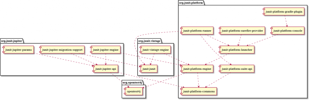 Voici le diagramme UML issu de la documentation de JUnit 5, montrant les dépendances entre les 3 modules et les jars constituant ces modules :