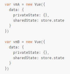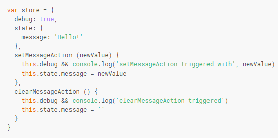 Une implémentation très simple de ce pattern est proposée sur le site de Vue.js. Elle consiste à définir un objet store contenant un attribut state regroupant toutes les données constitutives de l’état du store et un ensemble de fonctions permettant de modifier ces données :
