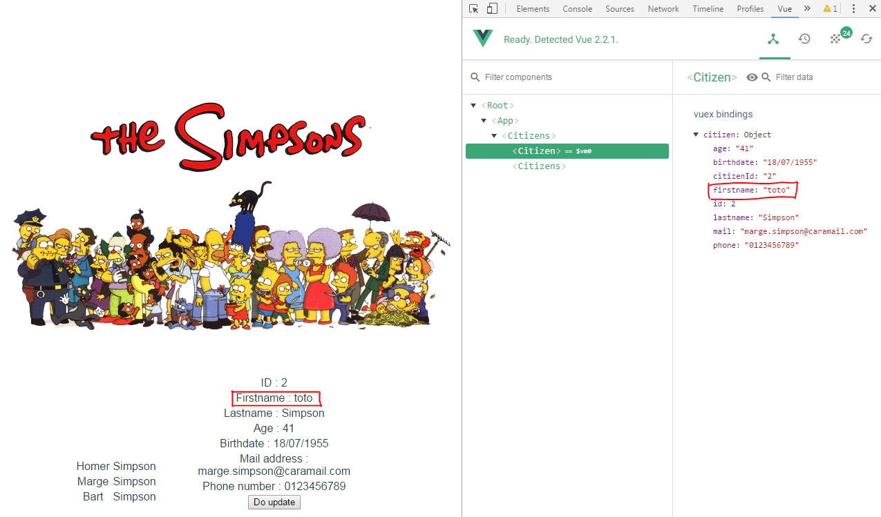 Résultat : le clic sur le bouton “Do update” modifie bien la valeur du prénom du citoyen dans le store.
