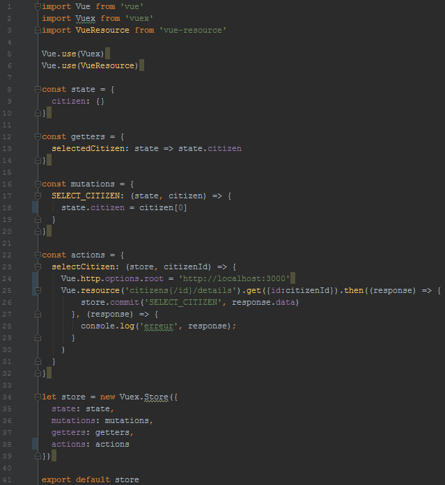 Dans notre application nous avons besoin que le citoyen sélectionné soit partagé entre tous les composants. C’est donc le citoyen sélectionné qui constituera le state. On va modifier le store pour faire en sorte d’ajouter :