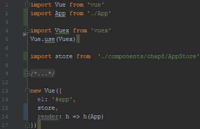 Le store défini, il faut à présent le déclarer dans notre application. Pour qu’il puisse être utilisé par tous les composants de l’application, on le déclare dans main.js :