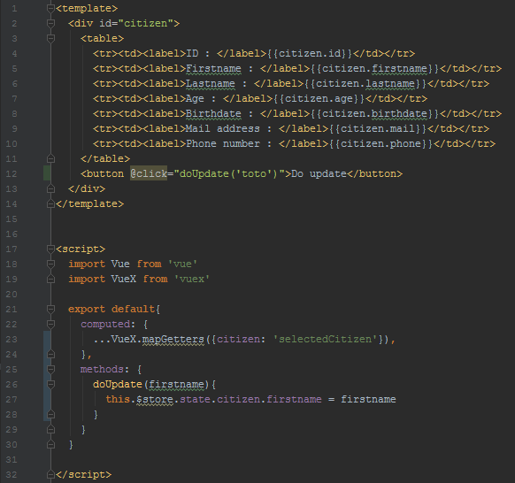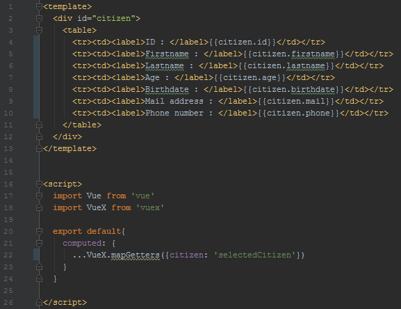 - que les data de la version précédente du composant, constituées de l’objet citizen stockant le citoyen sélectionné, ont été supprimées au profit de l’invocation du getter selectedCitizen du store ; on notera que le fait de rattacher ce getter au composant en l’intitulant citizen (via le handler mapGetters) permet de ne pas toucher au template qui est donc identique à la version précédente du composant ; de plus, positionner ce mapping en computed permet de profiter à nouveau du two-ways-binding puisque dès qu’un nouveau citoyen est sélectionné dans la liste, donc dès que le state du store est modifié, le composant réagit automatiquement en affichant les informations du nouveau citoyen sélectionné.