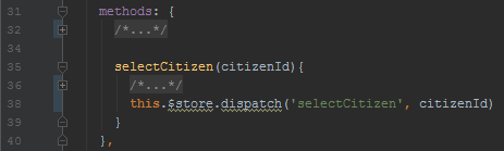 - une action permettant d’appeler l’API de détail d’un citoyen sur le citoyen sélectionné (cet appel était précédemment dans Citizen.vue) ;