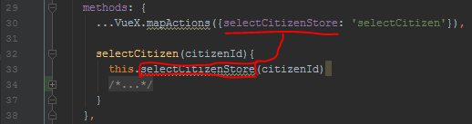 Plutôt que d’invoquer directement le store pour exécuter une action, il est également possible de rattacher les actions du store au composant via le handler mapActions. De cette façon les actions du store peuvent alors être invoquées dans le composant comme s’il s’agissait de méthodes du composant lui-même :