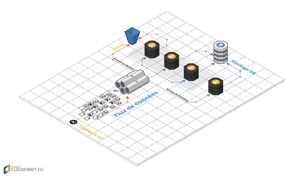 Dans cette architecture nous utilisons des systèmes BaaS pour la gestion des flux de données (exemple : AWS Kinesis ou Google Cloud Pub/Sub) puis des systèmes FaaS pour le prétraitement, le pré-calcul ainsi que l’enregistrement de celles-ci dans une base de données fournis par un système BaaS.
