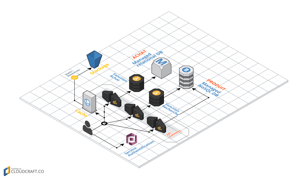 - Certaines fonctionnalités sont à garder côté serveur, par exemple, si elles impliquent des calculs intensifs ou nécessitent l’accès à des quantités importantes de données (recherche de produits). Pour cette fonctionnalité, au lieu d’avoir un serveur toujours en cours d’exécution, nous pouvons implémenter une fonction FaaS qui répond aux requêtes HTTP via une API Gateway.