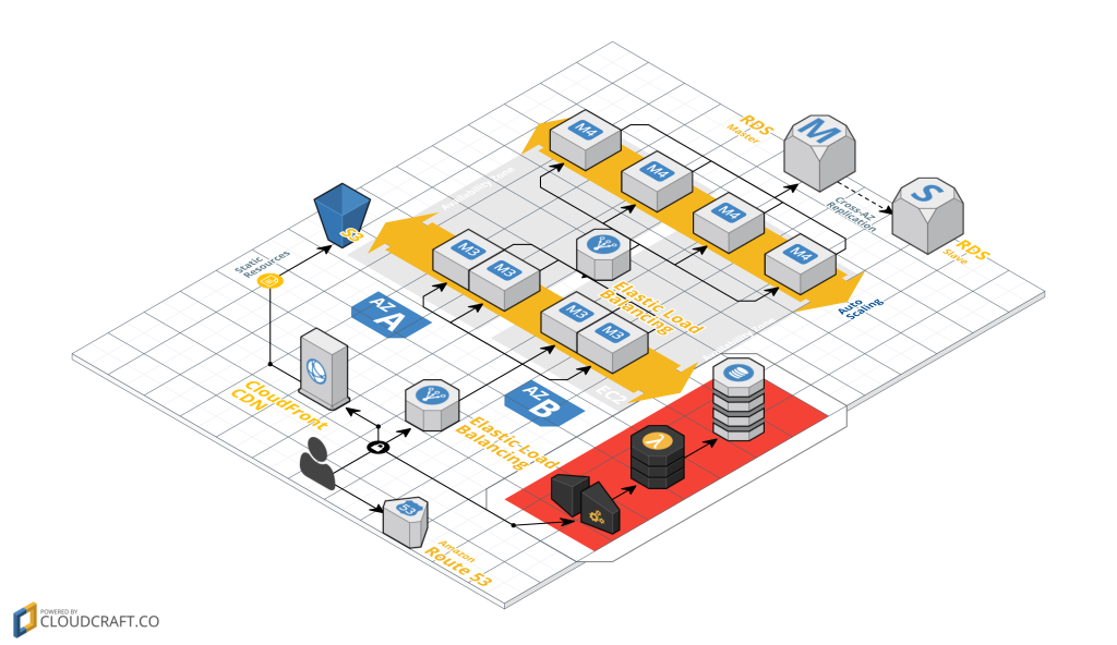 Il s’agit d’un exemple de transposition de l’architecture précédente en Serverless. Il y a un certain nombre de changements importants qui se sont produits ici. S’il vous plaît notez que ce n’est pas une recommandation d’une migration architecturale, je l’utilise simplement comme un outil pour exposer certains concepts sans serveur.