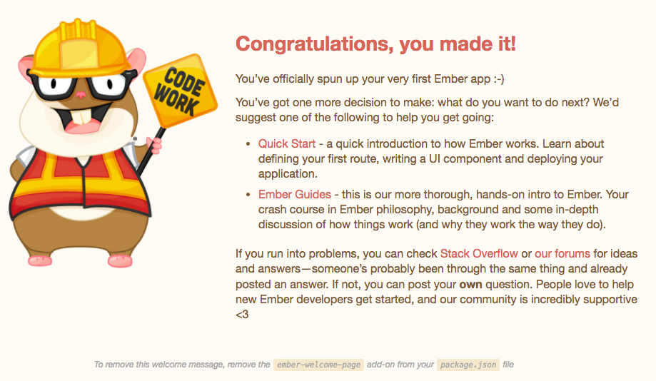 To remove this welcome message, remove the ember-welcome-page add-on from your package.json file