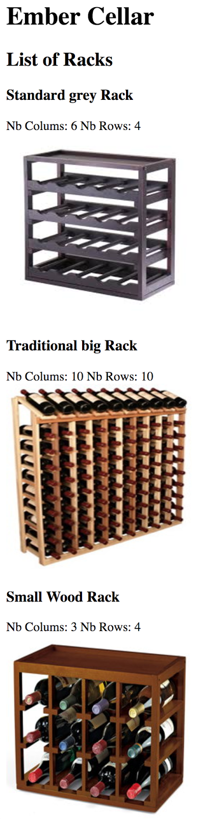 • Etape 1 (ce post) – Application simple avec données ‘rack’ retournées directement par le modèle sous forme d’un tableau JSON. Cette étape sera complété par l’utilisation de addons Ember pour rendre l’application plus esthétique et ergonomique.