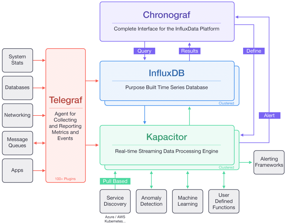InfluxData est une stack de supervision comprenant Telegraf, Kapacitor, InfluxDB et Chronograf. Chaque système à superviser doit avoir un agent local nommé Telegraf qui remonte les données vers le système de collecte Kapacitor.