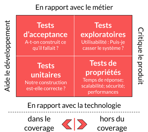 Ce schéma se lit sur deux axes, ainsi les tests unitaires sont en rapport avec la technologie et aident au développement. Dans la majorité des cas, lorsqu'on parle de taux de couverture on parle des tests de la partie gauche qui vont inclure :