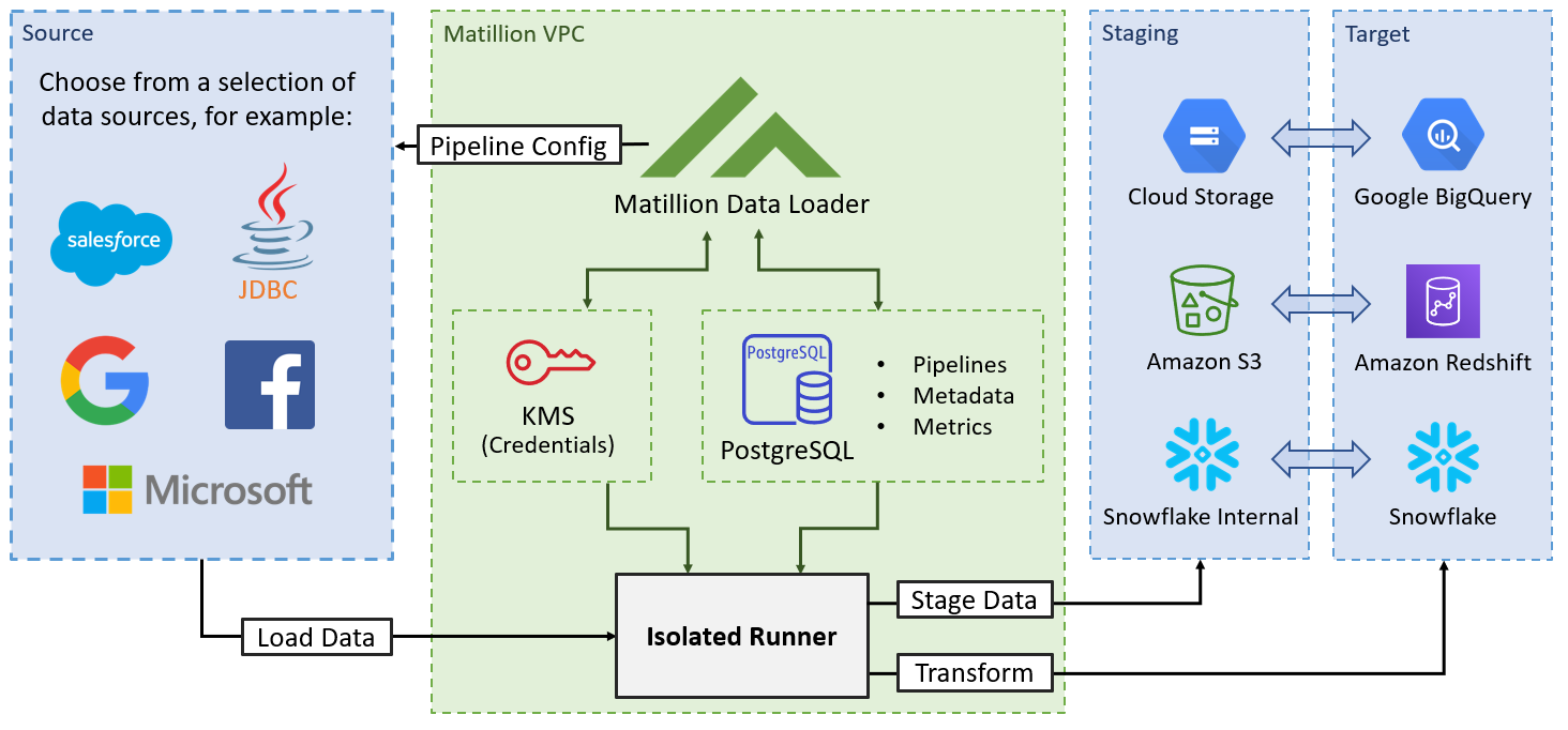 MDL se connecte à la source en utilisant les credentials fournis. Ces credentials sont envoyés au service lorsqu'un pipeline est déclenché. Le service envoie les données à un runner isolé dans le VPC de Matillion. Le runner place ensuite les données dans une zone de staging (par exemple Amazon S3 si le data warehouse cible est Redshift), avant de les charger dans la table cible dans le datawarehouse cible.