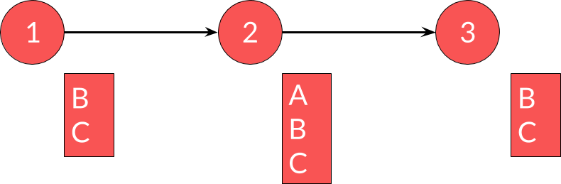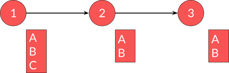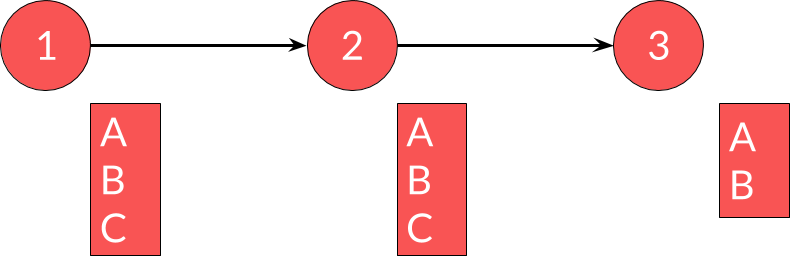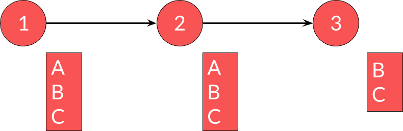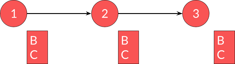 Si, dans le service 1, on veut changer A pour C (un nouvel attribut), on ne peut pas faire le changement en une fois car cela obligerait à synchroniser les changements. Il est cependant tout à fait possible de faire ce changement en plusieurs étapes. Tout d'abord, ajouter C dans le service 1 :