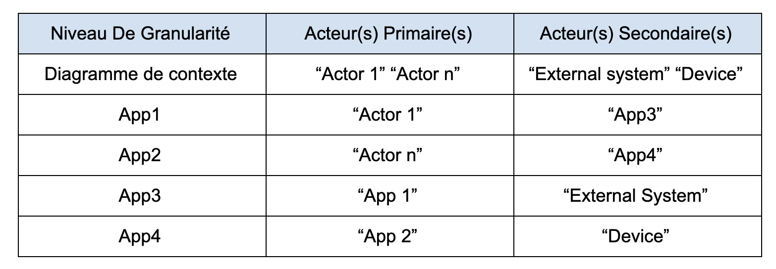 Au centre, nous avons le système dans son ensemble et gravitant autour on retrouve les acteurs. Ils ne sont pas, comme peut le laisser penser leur représentation, forcément des acteurs physiques. Ils peuvent aussi être d’autres systèmes, des instruments etc…