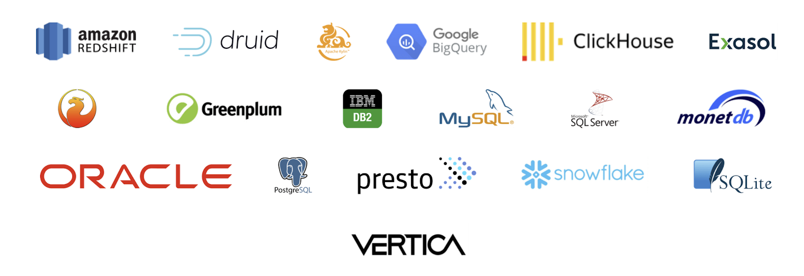L’image ci-dessous provient du site de Superset et montre une partie des bases de données connectables, parmi lesquelles on peut citer Snowflake, Amazon Redshift, ou encore Apache Druid pour des analyses temps réel.