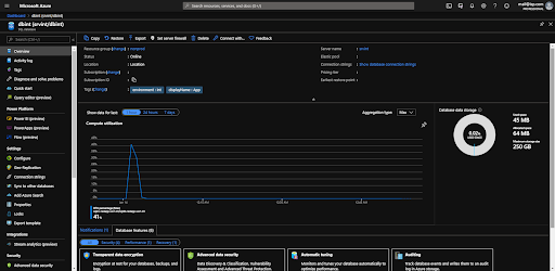 Cette vue est la page d’accueil d’une DB SQL Server. Elle permet entre autre d’accéder au serveur SQL Server via le lien srvint situé sur la droite de l’écran. Elle fournit aussi deux indicateurs de monitoring sur la DB que sont le taux d’utilisation du CPU et le taux de remplissage du disque.
