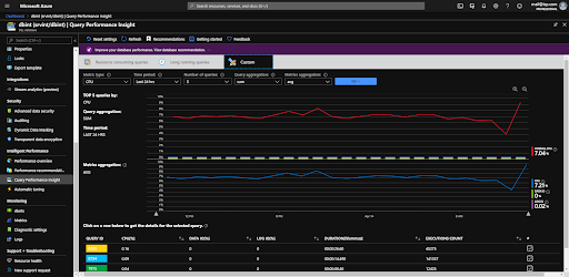 Dans le menu de gauche figurent des raccourcis utiles comme "Query Performance Insight" qui informe sur les performances de la base par type de métrique et "Connection Strings" qui liste les chaînes de connexion à la DB.