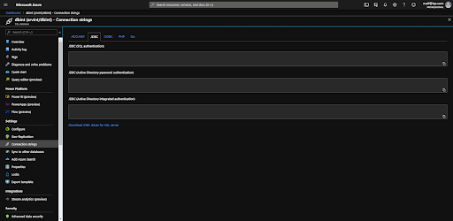 Cette vue liste les différentes chaînes de connexion disponibles pour les langages C#, C++, Java, PHP, Go et enfin le standard ODBC pour plus d’ouverture. Normalement, vous devriez apercevoir ces chaînes dans les encadrés mais elles ont été retirées pour des raisons de confidentialité. Il vous suffira de recopier l’URL qui vous intéresse dans votre propre configuration d’accès à la DB et de customiser vos informations d’authentification, le fameux user/password !