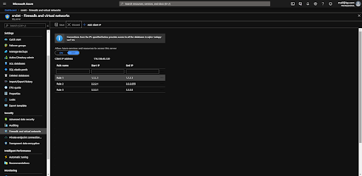 Cette vue permet de créer autant de règles que nécessaire pour autoriser des adresses IP uniques ou des plages d’adresses IP à se connecter à la DB. Les développeurs peuvent créer des règles pour autoriser les plages d’adresses IP de leur lieu de travail afin d’accéder aux DBs distantes depuis leur propre ordinateur.