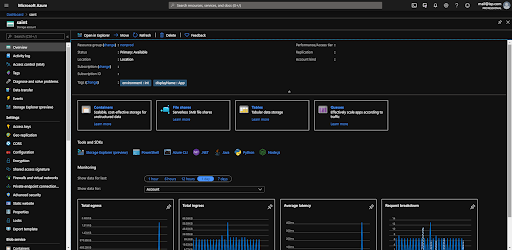 Dans le menu de gauche figurent également des raccourcis utiles comme Storage explorer qui permet de parcourir l’arborescence des ressources du storage ou encore Access keys qui permet de récupérer les informations de connexion applicative au storage code et enfin Shared access signature qui permet de générer des tokens d’accès aux ressources du storage en lecture et/ou écriture.