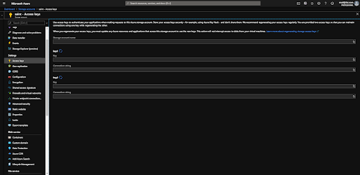Cette vue fournit les deux éléments clé pour la connexion d’une web app à un Azure storage que sont l’Account name et l’Account key. Ces deux informations seront renseignées dans les variables d’environnement de l’application et utilisées par la librairie Azure au moment de la connexion au storage de l’environnement concerné.