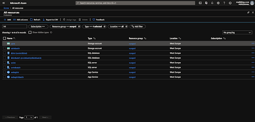 Comme son nom l’indique, cette vue liste exhaustivement toutes les ressources (web apps, DBs, storages, functions, etc.) auxquelles vous avez accès, tous projets et environnements confondus. Il est possible de jouer avec les filtres comme illustré Figure 2 pour afficher, par exemple, toutes les ressources de l’environnement d’intégration (int) ou encore pour afficher uniquement les web apps de l’int.