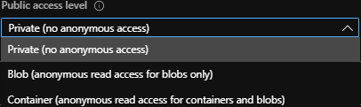 Les trois niveaux d’accès à un container sont Private, Blob et Container. Configuré sur Private, un token est nécessaire pour accéder aux ressources du container. Configuré sur Blob, il est possible d'accéder aux ressources hébergées dans le storage sans token d’accès. Enfin, configuré sur Container, il est possible d’accéder au contenu des containers sans token d’accès.