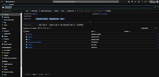 Cette vue détaille les composants d’un Resource Group (celui d’intégration). Les composants les plus intéressants sont les Web apps, les Storages (containers et queues), les DBs et les Function apps (fonctions serverless).