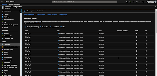 Cette vue liste les variables d’environnement que la web app récupère en fonction de l’environnement dans lequel elle est hébergée. Ainsi, il vous est aussi possible de les éditer mais aussi d’en créer ou d’en supprimer.
