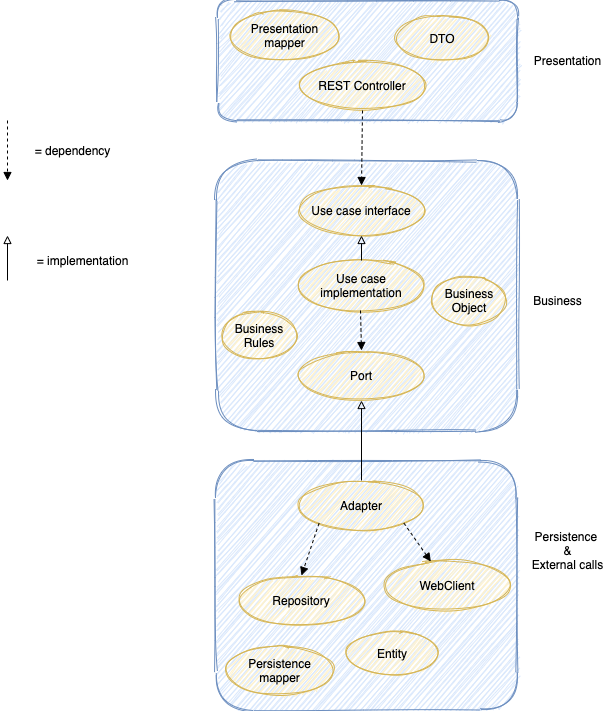 L’un des principes clés est que la business logic ne dépend de rien : ce sont les briques de présentation et de persistence qui dépendent de la business logic. Cette dépendance de l'extérieur vers l'intérieur est possible notamment grâce à l'inversion des dépendances et à la matérialisation des frontières de la business logic par des interfaces.