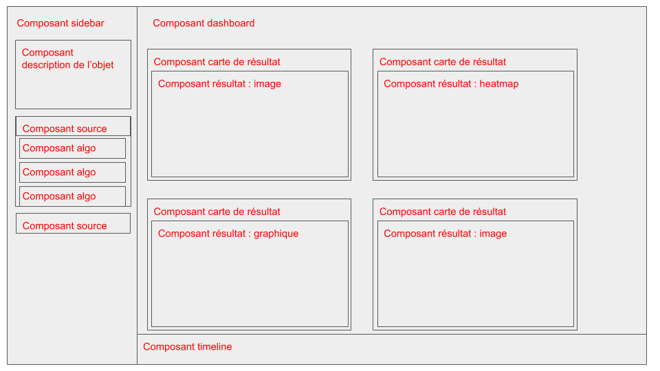 Comme vous pouvez le voir, la structure du dashboard laisse beaucoup de place aux cards contenant les résultats, tout en permettant une lisibilité des algorithmes appliqués sur l’objet sélectionné et un déroulement des dates propres aux résultats de cet objet.