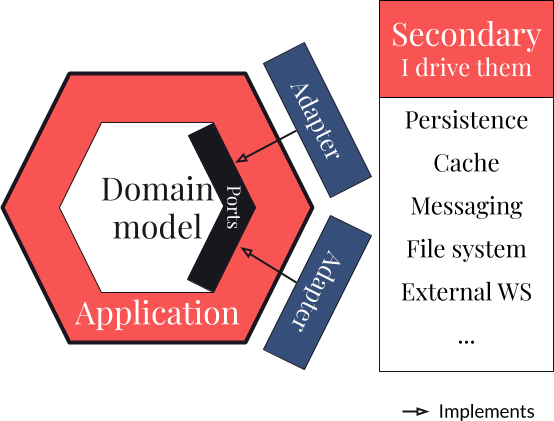Les secondary adapters sont aussi appelés output adapters. Ce sont les implémentations pour les éléments que notre Bounded Context va piloter : persistance, cache, file de messages, système de fichiers, etc... :