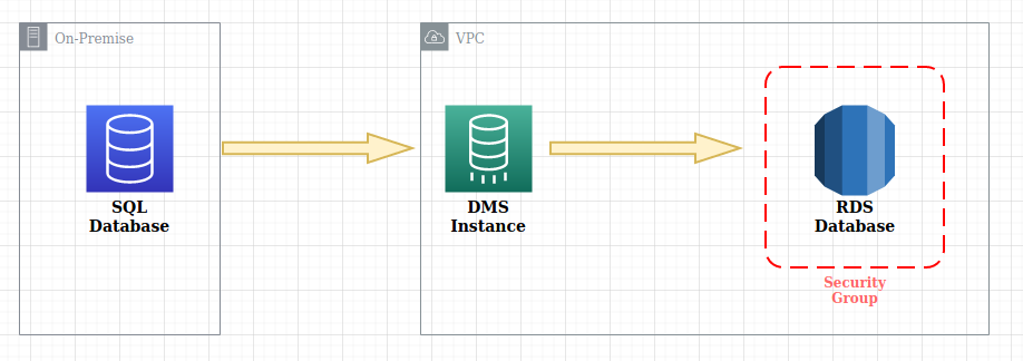Cette base doit être migrée sur AWS vers une instance RDS qui sera la base cible. Le cas de figure est donc modélisé comme suit :