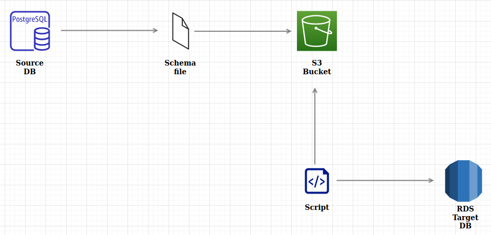 schemaFileName.sqldans un bucket S3 du compte AWS où se trouve la base RDS - Utilisation d’un script permettant de récupérer le fichier contenant le schéma depuis le bucket S3 pour faire un