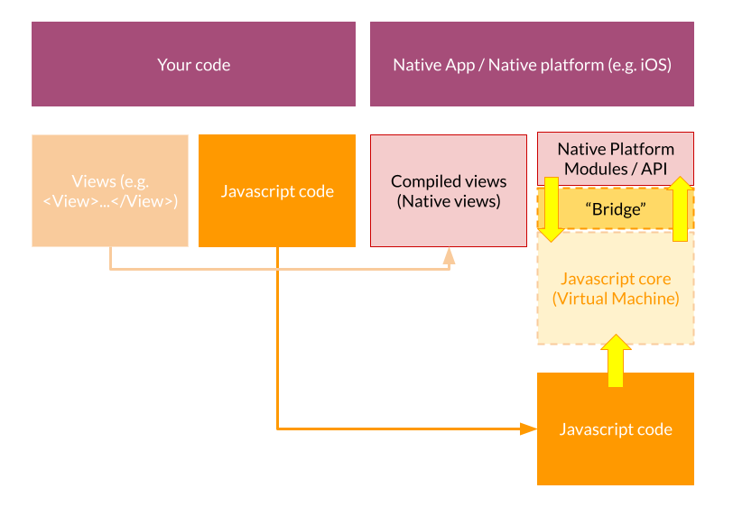 On peut voir que l’accès aux fonctionnalités natives passe par des ponts Javascript qui convertissent le code source en code interprétable par l’une ou l’autre des plateformes. Le code Javascript tourne dans une machine virtuelle qui est capable de communiquer avec les API natives.
