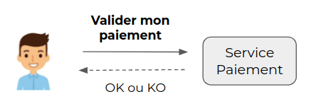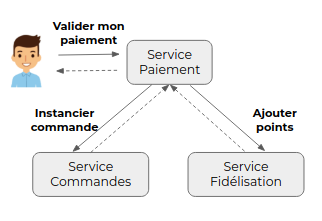Ici, lorsque le service de paiement va traiter la demande de validation, il va solliciter les autres services pour déclencher les actions qui suivent l’action de validation : par exemple ici l’instanciation de la commande correspondant au paiement et l’ajout de points de fidélité. C’est donc le service de paiement qui orchestre ici le scénario.