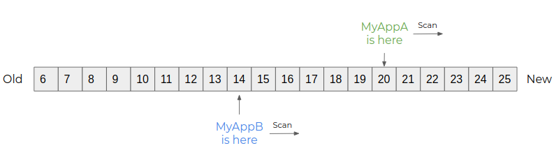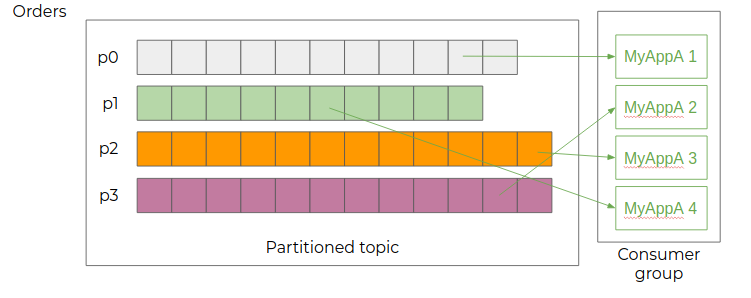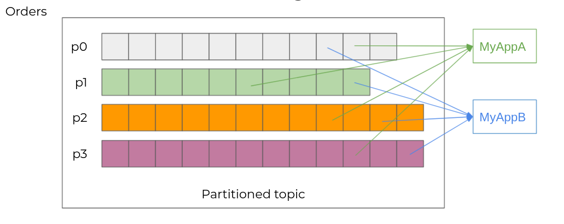 Plusieurs applications différentes vont pouvoir s’abonner à un même topic. Chacune va alors lire l’ensemble des partitions à son rythme. Chaque événement sera alors consommé par MyAppA et MyAppB.
