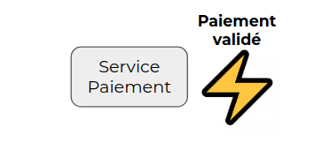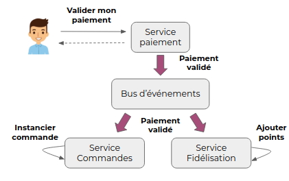 Reprenons le même scénario avec une approche event-driven : une fois que le service de paiement a traité la demande de validation dont il est responsable, il va émettre un événement sur un bus d’événements. Cet événement sera ici consommé par les services de commande et de fidélisation pour déclencher les actions qui suivent la validation d’un paiement.