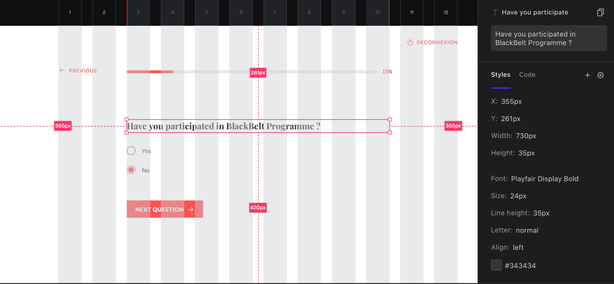J’ai eu l’occasion de participer au projet interne Social Survey, dont le but était de réaliser un questionnaire comportant plusieurs types de questions qu’on ne retrouvait pas sur les outils existants sur le marché. Cette application devait répondre à une maquette dessinée par un membre de l’équipe design d’IPPON tout en suivant les besoins d’un Product Owner.