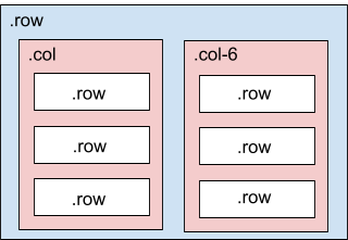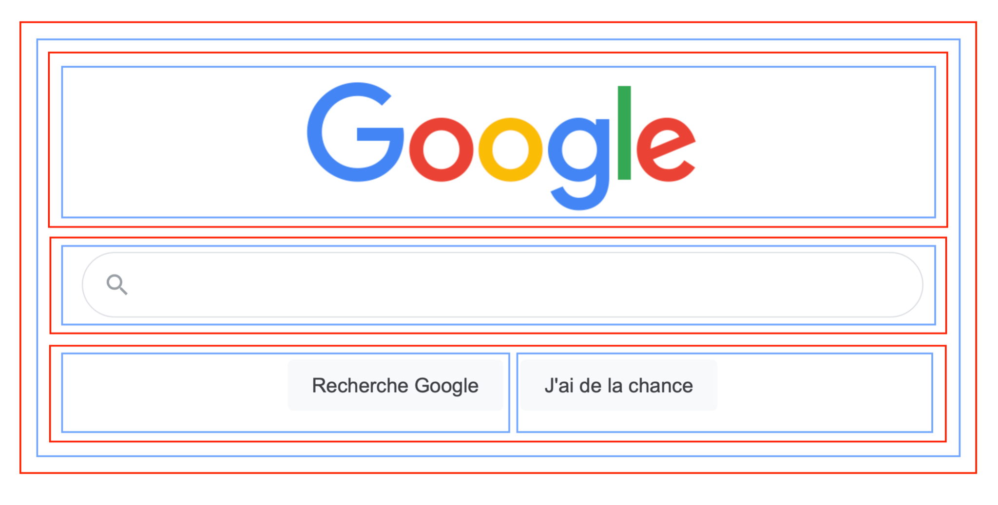 Ci-dessus, un exemple d’un découpage ligne/colonne de la page de recherche de Google, on représente en rouge une ligne (.row) et en bleu une colonne (.col).